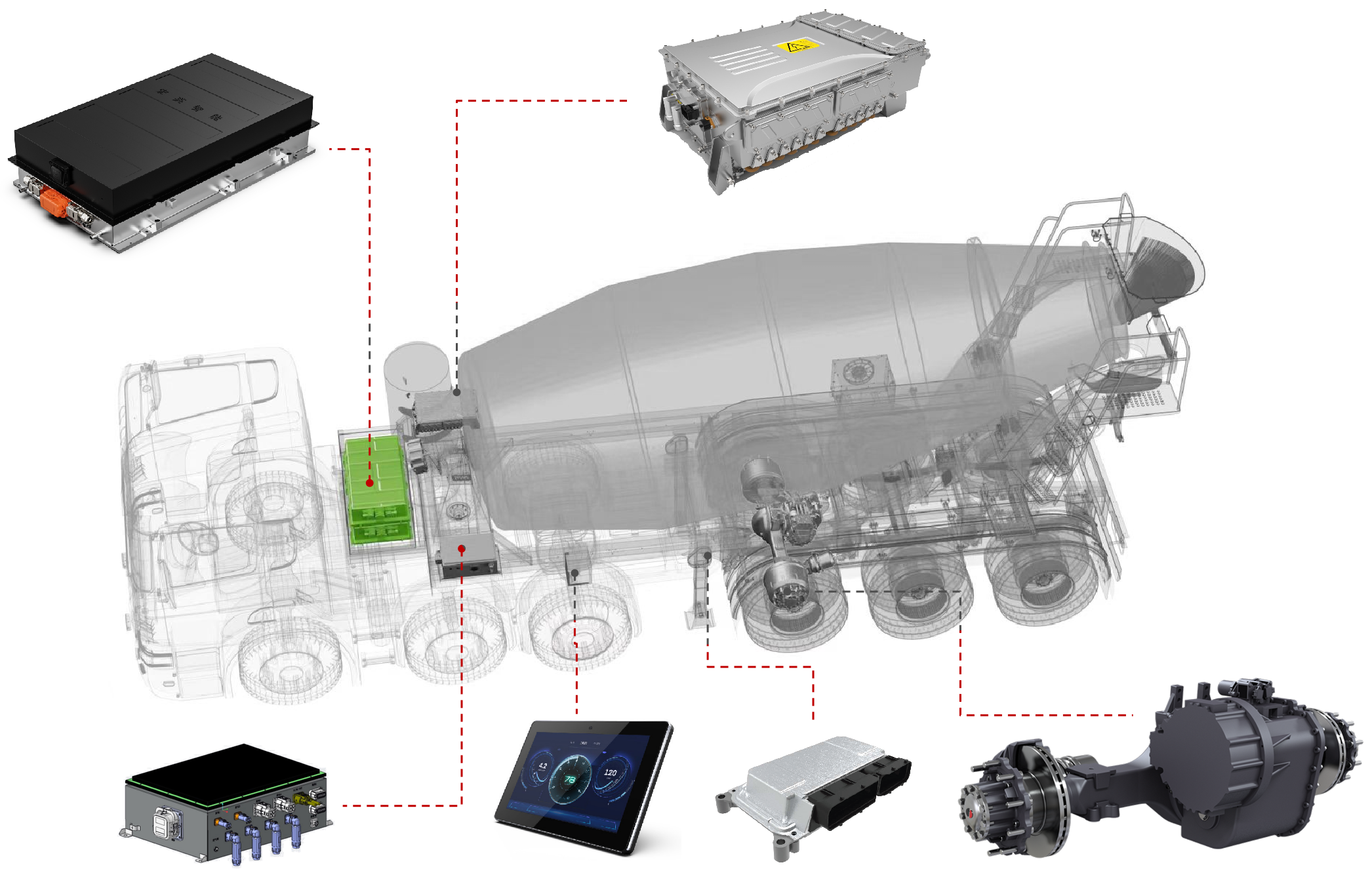 展会上,乐玩lewin智能的智电一体化解决方案引起了广泛关注。工程师团队在现场为参展观众详细介绍了混合动力牵引搅拌半挂车的系统方案。该方案基于乐玩lewin智能历经多年开发的eMagi智电平台,针对牵引搅拌半挂车进行了定向开发,涵盖以下几个方面: